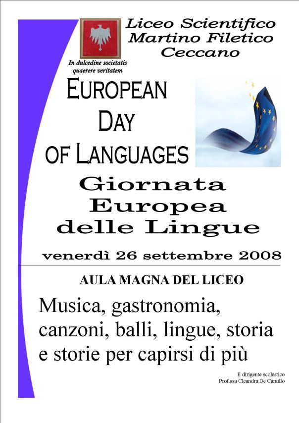 Una giornata intera dedicata alla lingue straniere: musica, gastronomia, cinema, storia, costume, scketch teatrali, canzoni, tutto quello che rappresenta la cultura di un popolo in rapporto alla sua lingua. Protagonisti dell’iniziativa sono gli allievi e i docenti del Liceo Scientifico Martino Filetico di Ceccano, indirizzo linguistico. L’aula magna della scuola fabraterna, venerdì 26 settembre, diventerà uno spazio aperto in cui poter passeggiare e visitare i vari stands che mostrano le caratteristiche dei paesi anglofoni, francofoni ed ispanofoni, le tre lingue straniere studiate dagli allievi del corso linguistico. Così si potrà assaggiare una crepe al grand marnier, alla crema d’arancia, o ascoltare della musica rock, o visitare Parigi a volo d’uccello, o suonare strumenti tradizionali di tradizione ispanica o gustare un britannico dolce al formaggio e così via. I ragazzi del corso linguistico ospiteranno i loro colleghi degli altri corsi e mostreranno loro come le lingue straniere siano uno strumento fondamentale per l’integrazione culturale, soprattutto nella dimensione europea. La manifestazione si inserisce all’interno della Giornata Europea delle Lingue fissata dal Consiglio d’Europa al 26 settembre di ogni anno, dopo la positiva esperienza dell’anno 2001 che la comunità dedicò appunto alla conoscenza delle lingue straniere. L’obiettivo della manifestazione è quello di sensibilizzare il grande pubblico all’importanza dell’apprendimento delle lingue, aumentare l’interesse e favorire la valorizzazione di tutte le lingue parlate in Europa e di incoraggiare l’apprendimento delle lingue, lungo tutto l’arco della vita all’interno o al di fuori dei tradizionali sistemi educativi, in risposta ai mutamenti socio-culturali in atto e come fattore di realizzazione personale. L’ideazione della giornata è stata degli allievi delle classi del corso linguistico e delle loro insegnanti di lingue, le professoresse Agnese Altobelli, Mirella Crecco e Lucie Zorzi. Durante l’anno le classi del linguistico saranno anche impegnate in diversi stages linguistici all’estero, e saranno in Olanda per un Progetto Comenius dal titolo Vestigia Caesaris, con scuole provenienti dal Belgio, dall’Olanda, dalla Germania e dall’inghilterra.