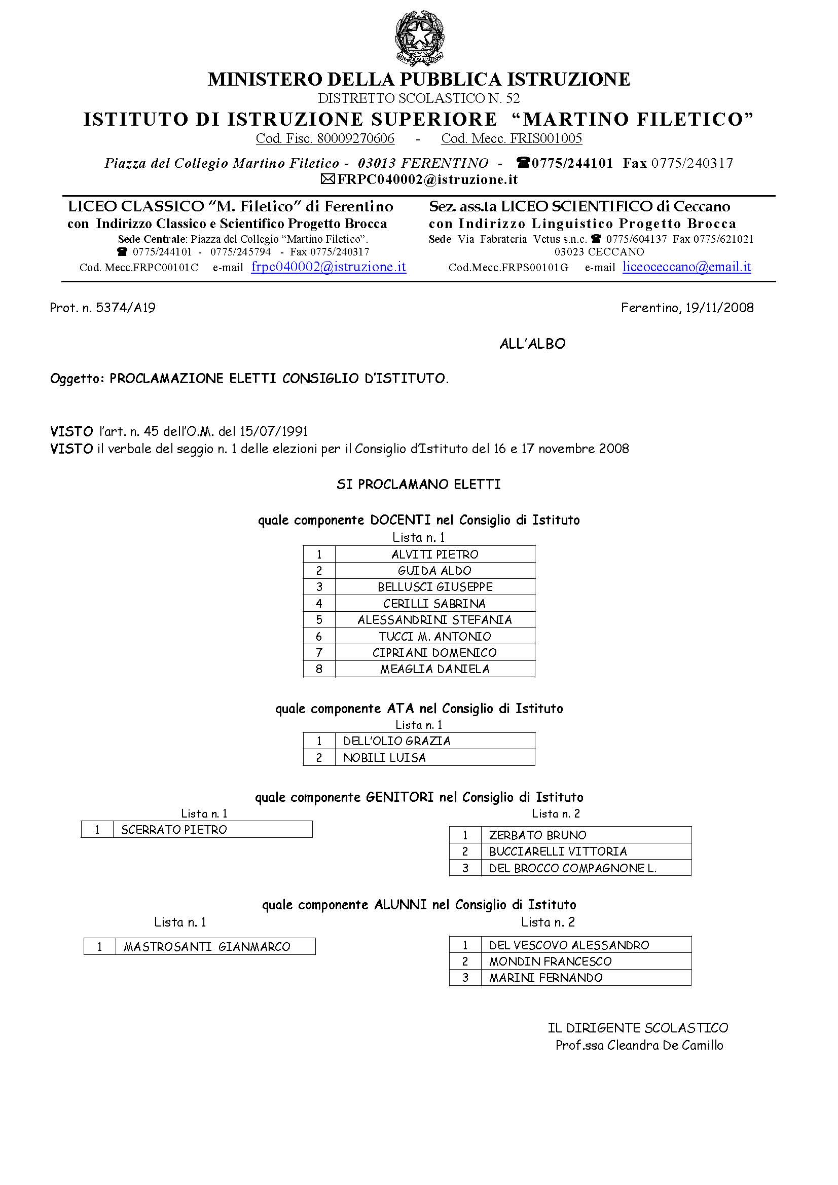 Domenica 16 dalle 8 alle 12 e lunedì 17 dalle 8 alle 13,30 sono gli orari d’apertura dei seggi per il rinnovo del consiglio d’istituto del Liceo. Devono essere eletti 8 insegnanti, 4 alunni, 4 genitori e 2 rappresentanti del personale non docente. Il Consiglio d’Istituto è l’organismo di partecipazione più importante per la vita del Liceo ed è unico per Ferentino e Ceccano. Il consiglio delibera sul tutti gli aspetti organizzativi: orari, corsi, acquisti, calendario delle lezioni, attività aggiuntive, viaggi e quant’altro riguarda la vita della scuola.