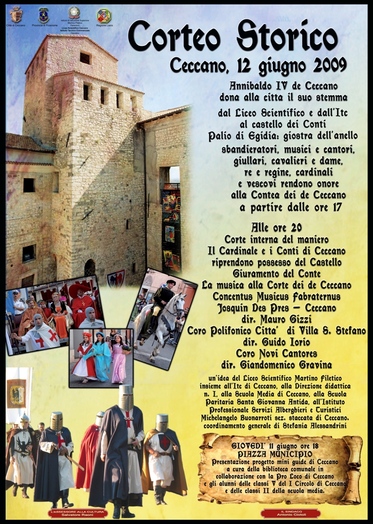 CECCANO _ Saranno in 6 a contendersi il palio di Egidia, madre del Conte Giovanni I de Ceccano, una delle prime donne in Europa a recarsi a piedi a Santiago di Compostela. Sarà questo, venerdì 12 pomeriggio a Ceccano, in Piazza XXV Luglio, il momento centrale del Corteo Storico che ricorda il passaggio nella cittadina fabraterna di Annibaldo IV, segretario di stato di Clemente VI, nel 1350 ad Avignone. Siamo in giugno ed Annibaldo, legato pontificio nell’Urbe per il II Giubileo, viene inviato dal papa in ambasceria a Napoli, dove regnano Giovanna d’Angiò e Ludovico d’Ungheria. Il gran principe di Avignone, amico di Petrarca e di Simone Martini, venerato ed osteggiato da re e regine, da guerrieri e da santi, viaggia con un seguito imponente: cavalieri, dame, cappelle musicali, giocolieri, musici, vescovi e cardinali, crociati e servitù, tutti espressione di una grande potenza non soltanto visibile nella ricchezza ma soprattutto nello stile di vita: un anticipatore del Rinascimento, come l’ha definito il suo biografo, Mark Dyckmans. Lo accoglie suo fratello, Tommaso II, conte di Ceccano, che mette in mostra la ricchezza di una contea ancor viva e potente: saranno in 500 a rappresentare il trionfo dei de Ceccano nello splendore degli abiti del XIV secolo. Al fratello cardinale, Tommaso offre un palio che viene disputato da 6 cavalieri, ciascuno dei quali rappresenta una delle porte della città: Porta Castello (cui fanno riferimento il Boschetto, il quartiere Di Vittorio, le contrade Peschieta e Callami) Porta S. Giovanni (con la Madonna della Pace, Grutti, Pescara, Colle Alto, Badia) Porta Nuova (con Borgo Garibaldi, Rifugio, via Gaeta, Maiura, Cardegna, Spina) Porta Abbasso (con il Ponte, S. Maria, Casamarciano, Farneta), Porta S. Angelo (con Borgata, Stazione, Acquasanta, Colle Pirolo, Casette) e Porta S. Pietro con Vigne Vecchie, Colle Leo, Colle S. Paolo, Faito). Il corteo raggiungerà Piazza XXV Luglio dopo un altro momento significativo. In Piazza Madonna della Pace, Annibaldo incontrerà sua madre Perna Stefaneschi cui renderà omaggio. Quindi la giostra dell’anello e l’assegnazione del Palio ad una delle porte. Nella prima edizione toccò a Porta S. Giovanni, ora ne è detentrice Porta Castello. Dopo la disputa, la corte raggiungerà il castello: qui ci sarà l’omaggio dei nobili ad Annibaldo, cui seguirà uno spettacolo medievale con cori, musici, danzatori e sbandieratori. Il corteo storico è organizzato dal comune di Ceccano ed è frutto di un progetto didattico iniziato dal Liceo Scientifico Martino Filetico e che coinvolge ora altre scuole di Ceccano: l’Itc, la Direzione Didattica I Circolo, la Scuola Media di Ceccano, ‘Istituto Professionale Alberghiero Michelangelo Buonarroti e la Scuola Primaria Paritaria S. Giovanna Antida: assieme a loro partecipano la Pro Loco di Ceprano e quella di Villa S. Stefano, i cavalieri del Gruppo Camilla Regina, di Amaseno, il Gruppo storico Castello Colonna di Patrica, il coro Josquin Des Pres, il coro Novi Cantores, il coro di Villa S. Stefano, diretti rispettivamente da Mauro Gizzi, Giandomenico Gravina e Guido Iorio. Il coordinamento generale è della prof.ssa Stefania Alessandrini, responsabile del progetto Annibaldo al Liceo Scientifico, le scenografie sono di Domenico Cipriani, che ha realizzato anche le aquile argento in campo rosso che domineranno Ceccano.