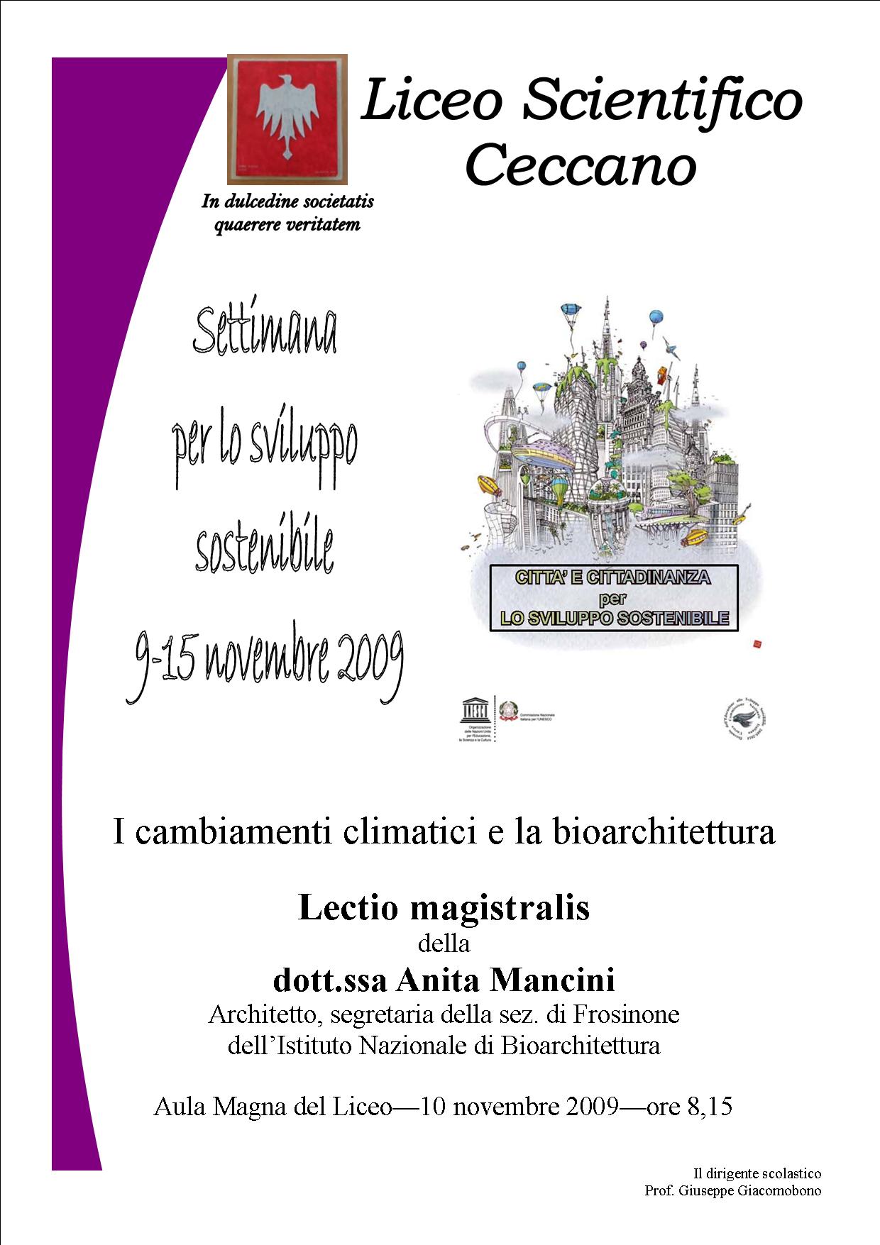 I cambiamenti climatici come indicatori della salute del pianeta. E’ questo il tema della lectio magistralis che l’arch. Anita Mancini, segretaria della sezione di Frosinone dell’Istituto Nazionale di Bioarchitettura, terrà per gli studenti il 10 novembre, nell’aula magna del Liceo di Ceccano, con inizio alle ore 8,15. L’iniziativa, assunta dalla prof.ssa Maria Luisa Messina, si inserisce nell’ambito della Settimana dello Sviluppo Sostenibile, proclamata dall’Unesco per il periodo 9-15 novembre.