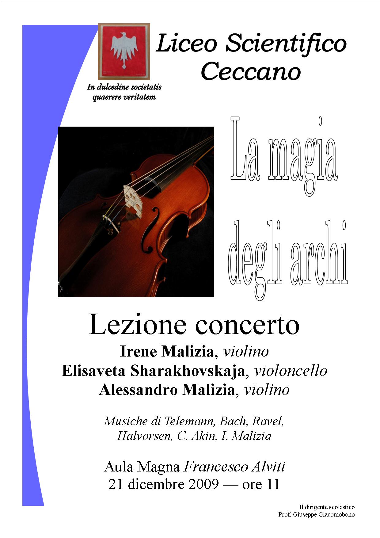 La magia degli archi è il tema della lezione concerto che avrà luogo lunedì 21 dicembre nell’aula magna Francesco Alviti del Liceo di Ceccano, per alcune classi e per i componenti del coro e dell’orchestra del Liceo. A presentare il suono dei violini e dei violoncelli saranno Irene ed Alessandro Malizia, violinisti, ceccanesi ma ora in Austria per motivi artistici, e Elisaveta Sharakhovshaja, violoncellista. I tre valenti musicisti presenteranno di G. Ph. Telemann, Fantasia IX per violino solo, di I. Malizia, dalla Suite in cinque quadri “La luna di Dicembre” per due violini: il II movimento Allegro giocoso (Scende la neve), il III Allegro (La città in festa) e il V Finale (E’ Natale!). Poi di Can Aksel Akin Preludio per Violoncello solo, di Bach Ciaccona, Sarasate Introduzione e tarantella , Ravel Sonata per violino e Violoncello ed infine di Halvorsen Passacaglia per violino e violoncello