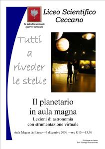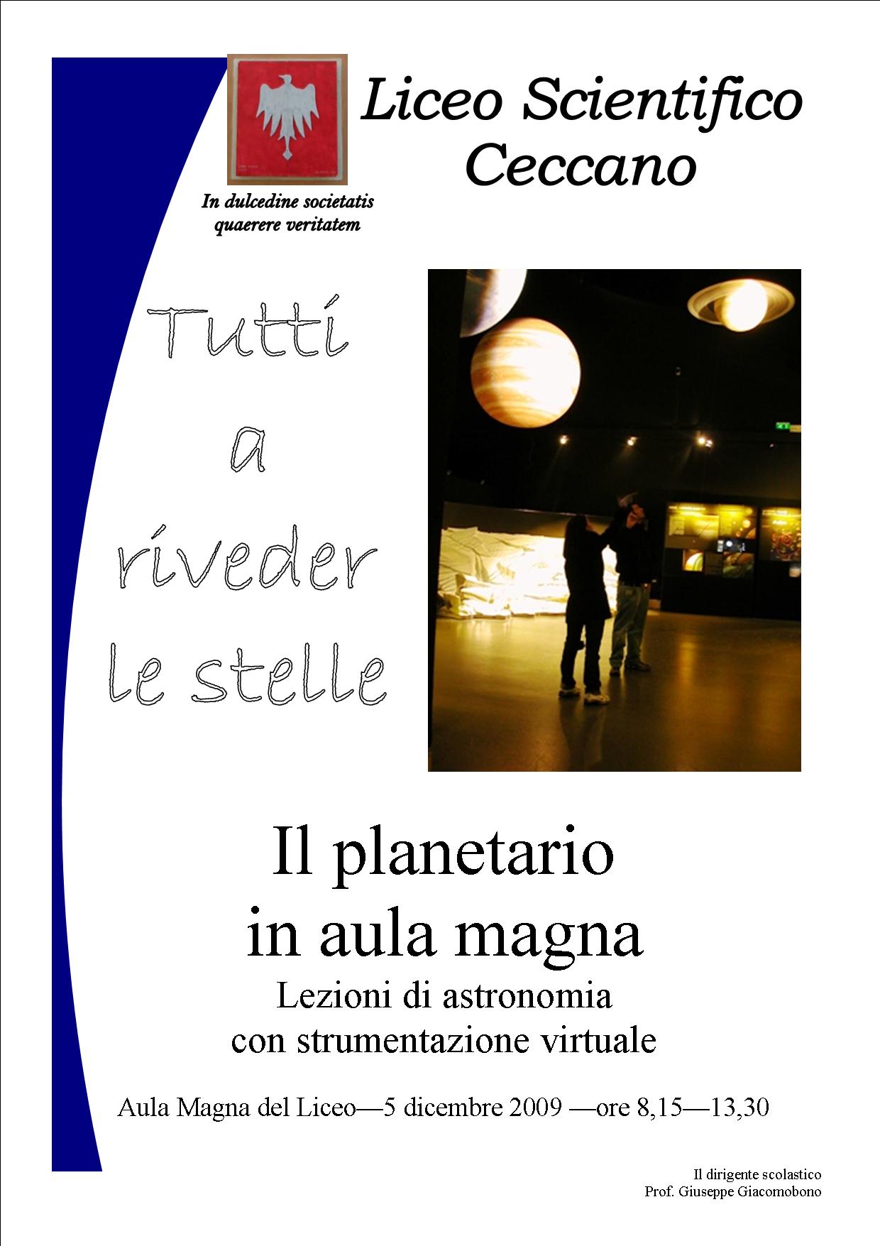 L’aula magna diventa un cielo stellato: sabato 5 dicembre sarà possibile studiare il cielo stellato nella impressionante ricostruzione di un planetario elettronico nell’aula magna del Liceo Scientifico di Ceccano. L’iniziativa, curata dalle insegnanti di scienze, le prof.sse Bartolini e De Angelis, prevede l’installazione nel laboratorio di un grande planetario sotto il quale troveranno posto le classi che studiano geografia astronomica. I ragazzi staranno a testa in su ed osserveranno il movimento di galassie, stelle, pianeti, tutto l’affascinante universo che pare immoto e che invece è animato da un incessante movimento che il planetario riesce a far cogliere. L’iniziativa delle insegnanti di scienze del Liceo di Ceccano si inserisce nell’ambito del più grande progetto di promozione della cultura scientifica che è rivolto agli allievi di tutte le classi del Liceo fabraterno.