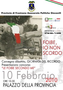 La Provincia di Frosinone, con il Patrocinio del Ministero della Gioventù, ha bandito un concorso sul “Giorno del ricordo” denominato “Le foibe secondo me” rivolto agli studenti delle scuole medie superiori (quarte e quinte).