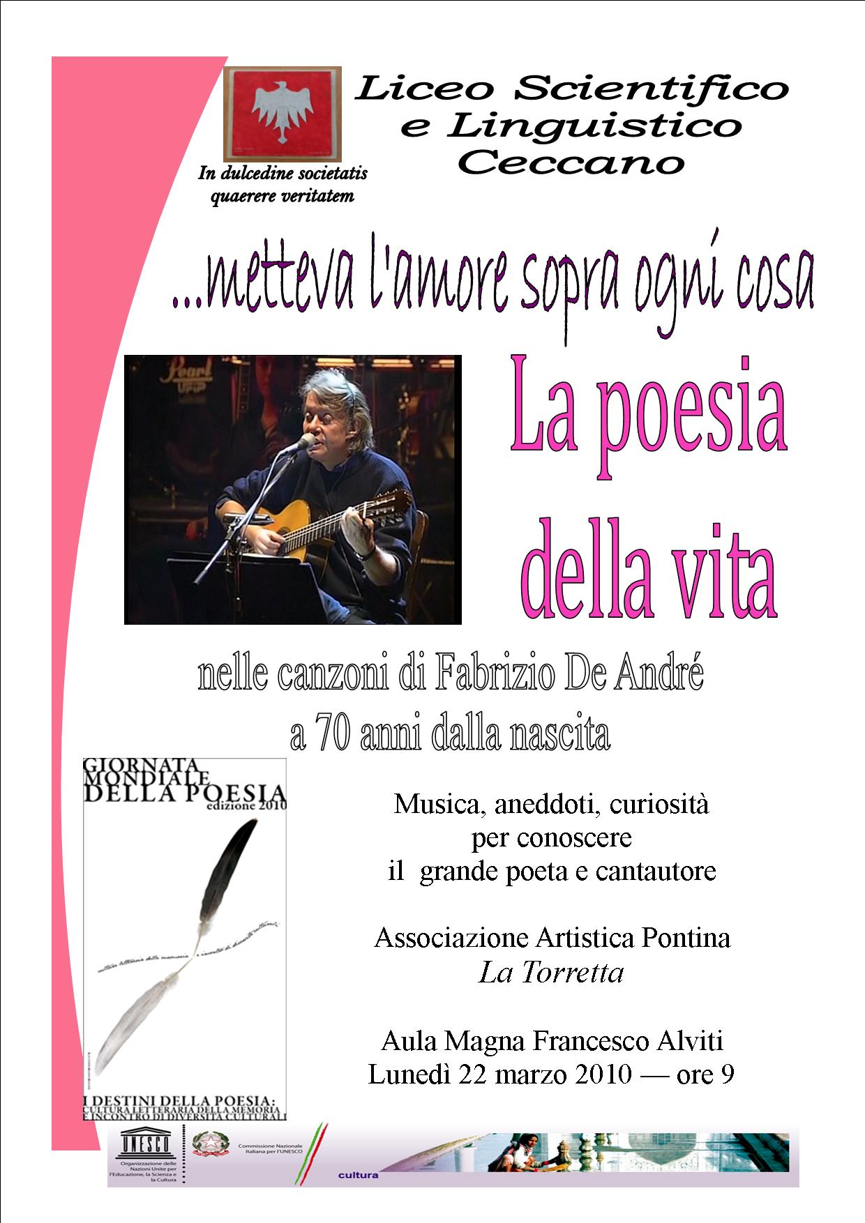 La poesia della vita: questo il tema della Giornata Mondiale della Poesia al Liceo fabraterno, secondo le indicazioni dell’Unesco. Al centro dell’attenzione ci sarà Fabrizio De André nel 70° anniversario della sua nascita. Le canzoni del cantautore ligure saranno esaminate dunque dal punto di vista del contributo poetico alla comprensione del mondo contemporaneo. Le canzoni di De André, poesia della vita, saranno presentate dall’Associazione Artistica Pontina La Torretta nell’aula Magna Francesco Alviti, lunedì 22 marzo 2010 alle ore 9, in due spettacoli che coinvolgeranno numerose classi dell’istituto fabraterno. Il titolo dello spettacolo è “…metteva l’amore in ogni cosa”. La manifestazione è stata curata dai professori D’Annibale e Lombardi.