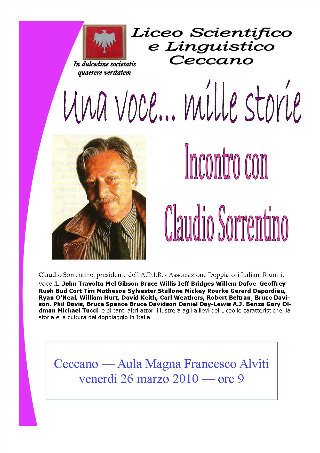 La voce di John Travolta, Mel Gibson, Bruce Willis, Jeff Bridges, Willem Dafoe, Geoffrey Rush, Bud Cort, Tim Matheson, Sylvester Stallone, Mickey Rourke, Gerard Depardieu, Ryan O’Neal, William Hurt, David Keith, Carl Weathers, Robert Beltran, Bruce Davison, Phil Davis, Bruce Spence, Bruce Davidson Daniel Day-Lewis A.J. Benza Gary Oldman Michael Tucci e tanti altri: Claudio Sorrentino, uno dei più importanti doppiatori italiani, sarà venerdì mattina, 26 marzo, al Liceo di Ceccano per presentare agli allievi l’arte del doppiaggio, una delle più raffinate espressioni della cinematografia mondiale. Una voce … mille storie è il titolo dell’incontro che si inserisce nell’ambito delle attività legate alla storia del Cinema nel liceo fabraterno. L’incontro con Claudio Sorrentino avrà inizio alle 9 e coinvolgerà alcune classi del Liceo insieme ai ragazzi del gruppo Cinema che hanno partecipato già a diverse iniziative programmate dall’istituto. L’iniziativa dell’incontro con Claudio Sorrentino è stata presa nell’ambito dell’area di progetto della classe V B ed è stata curata dalle professoresse Alessandrini e Marro.