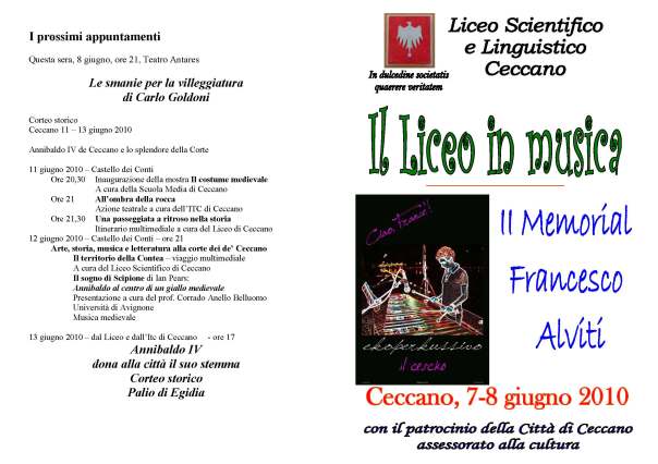 Bach e Goldoni, la musica e le smanie della villeggiatura, la forza dell’orchestra di fiati e la delicatezza dell’arpa, l’insieme entusiasmante del coro: questi alcuni dei molteplici motivi del II Memorial Francesco Alviti che il Liceo di Ceccano ha voluto dedicare al giovane musicista, ex alunno, scomparso un anno fa,dopo una drammatica lotta contro il male. Il memorial si svolgerà al Liceo, nel piazzale, lunedì 7 giugno dalle ore 18 alle 20, con i gruppi rock della scuola e al teatro Antares, martedì 8 giugno, in due momenti: il primo avrà come protagonista la musica e vedrà sulla scena oltre 100 allievi, segno concreto dell’attenzione che il Liceo fabraterno ha sempre dato alla musica e ai talenti musicali degli studenti. Il secondo momento, alle 21, sarà invece dedicato al teatro e sarà, questo, dedicato al prof. Domenico Cipriani, Memmino, scomparso improvvisamente il 26 aprile scorso. Ci sarà la messa in scena di Le smanie per la villeggiatura di Carlo Goldoni, con attori, ballerini ed orchestrali. La regia è di Marco Angelilli con le scene di Domenico Cipriani, già preparate prima della sua morte. La rappresentazione dell’opera goldoniana costituirà anche il I Memorial dedicato a Memmino Cipriani. L’iniziativa ha il patrocinio dell’Amministrazione Provinciale di Frosinone, del Comune di Ceccano e di numerosi privati che hanno contribuito alla raccolta di fondi. In scena martedì ci saranno oltre 200 allievi del Liceo, impegnati nella parte musicale e in quella teatrale. I due memorial aprono una intensa settimana di attività per il Liceo di Ceccano che si concluderà poi domenica 13 con il Corteo Storico.