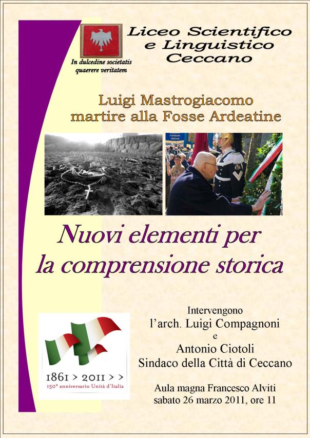 Luigi Mastrogiacomo una vittima? un eroe? Il ceccanese ucciso dai tedeschi alle Fosse ardeatine il 23 marzo del 1944 fu preso per “errore” o fu individutato tra i combattenti della resistenza romana? E’ la domanda a cui cercherà di rispondere il convegno che avrà luogo sabato 26 marzo, alle ore 11 nell’aula magna Francesco Alviti del Liceo di Ceccano, per iniziativa dell’amministrazione comunale. Al convegno parteciperanno l’arch. Luigi Compagnoni, che da qualche anno sta dedicando tempo ed energie alla ricostruzione delle vicende dei tanti ceccanesi coinvolti nella II Guerra Mondiale. Luigi Mastrogiacomo, che a Ceccano è ricordato con una scuola elementare a lui intitolata, è uno di questi: per decenni è stato considerato una vittima inconsapveole della strage. Ora nuovi elementi comproverebberio invece che fosse pienamente impegnato nella resistenza antinazista. Il convegno si svolge nell’ambito delle celebrazioni per il 150° Anniversario dell’unità d’Italia.