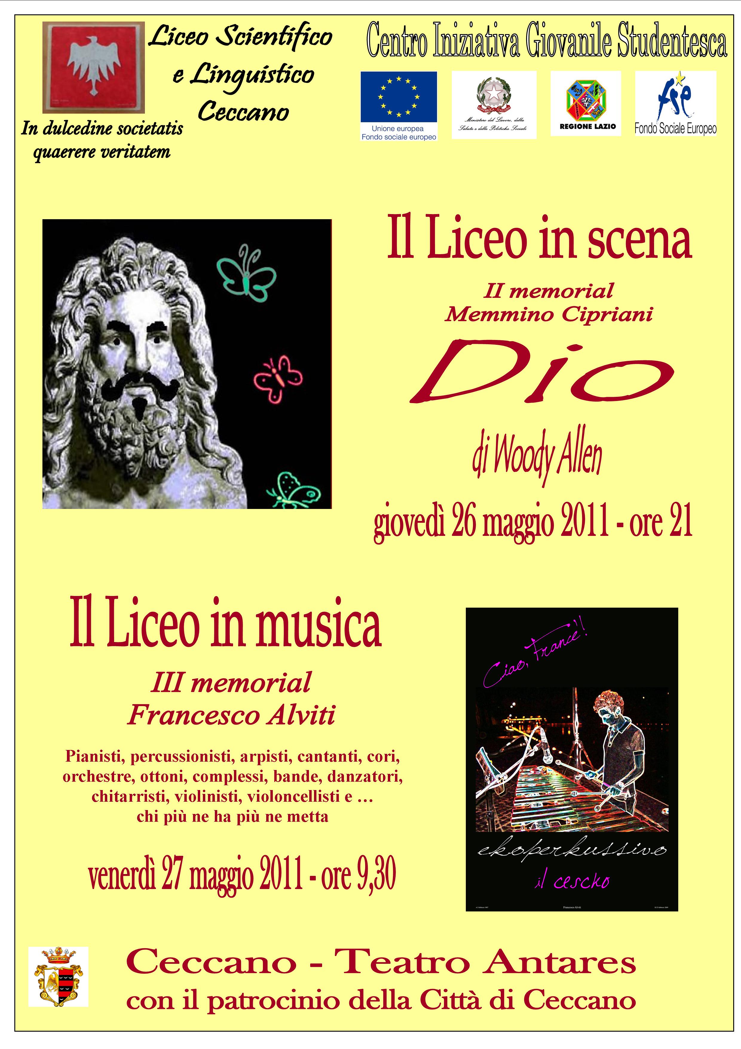 Teatro, musica, corteo storico, scienze, sport: il Liceo mostra i risultati dell’anno che sta per finire. Si comincerà giovedì 26 maggio con la II edizione del Memorial dedicato a Memmino Cipriani: sul palcoscenico dell’Antares, alle ore 21, gli allievi del laboratorio teatrale, diretti da Marco Angelilli, metteranno in scena la commedia di Woody Allen Dio, per una serata di puro divertimento, con gags per tutti. Il giorno dopo toccherà agli allievi delle classi musicali: Mozart e il suo Flauto Magico, Beethoven, Bela Bartok, Bach, Chopin saranno presentati da violinisti, violoncellisti, pianisti, percussionisti, arpisti, cantanti, cori, orchestre, ottoni, complessi, bande, danzatori, chitarristi, in una manifestazione dedicata al giovane percussionista Francesco Alviti, scomparso più di due anni fa.