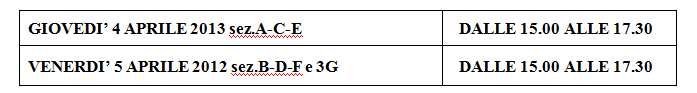 Il secondo incontro pomeridiano scuola famiglia si terrà nei giorni 4 e 5 aprile con il seguente orario