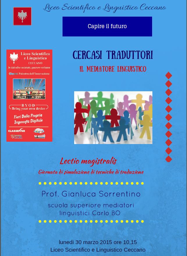 Lunedì 30 marzo, gli allievi delle ultime classi del Liceo Linguistico avranno una lectio magistralis del prof. Gianluca Sorrentino della Scuola Superiore in Mediazione Linguistica Carlo Bo. Ci saranno due ore di simulazione di tecniche di traduzione. L’iniziativa, curata dalla prof.ssa Rita Cipriani, si inserisce nelle attività di orientamento scolastico del Liceo per i propri allievi.