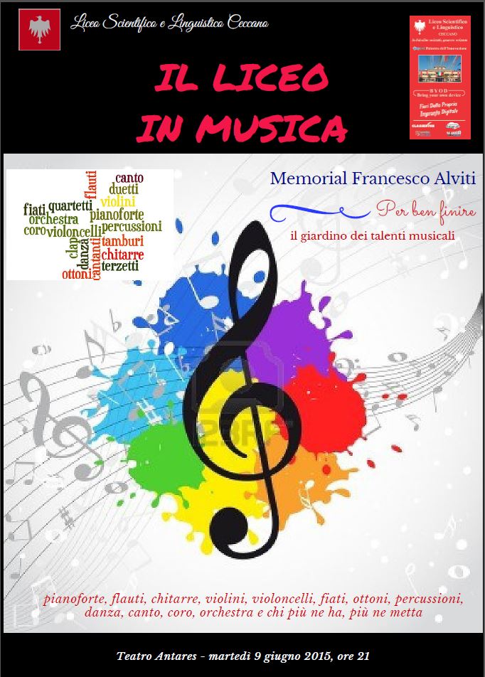 Pianisti, percussionisti, arpisti, cantanti, cori, orchestre, ottoni, complessi, bande, danzatori, chitarristi, violinisti, violoncellisti e … chi più ne ha più ne metta. Questo l’allettante programma de Il Liceo in musica, manifestazione finale delle classi musicali del Liceo che si terrà lunedì 9 giugno al Teatro Antares di Ceccano a partire dalle ore 21,30.Una bella serata di arte e scuola da vivere nel divertimento e nella gioia dello stare insieme. La manifestazione è dedicata a Francesco Alviti, ex allievo del Liceo, percussionista, scomparso nel 2009 dopo aver lottato invano con il suo male.