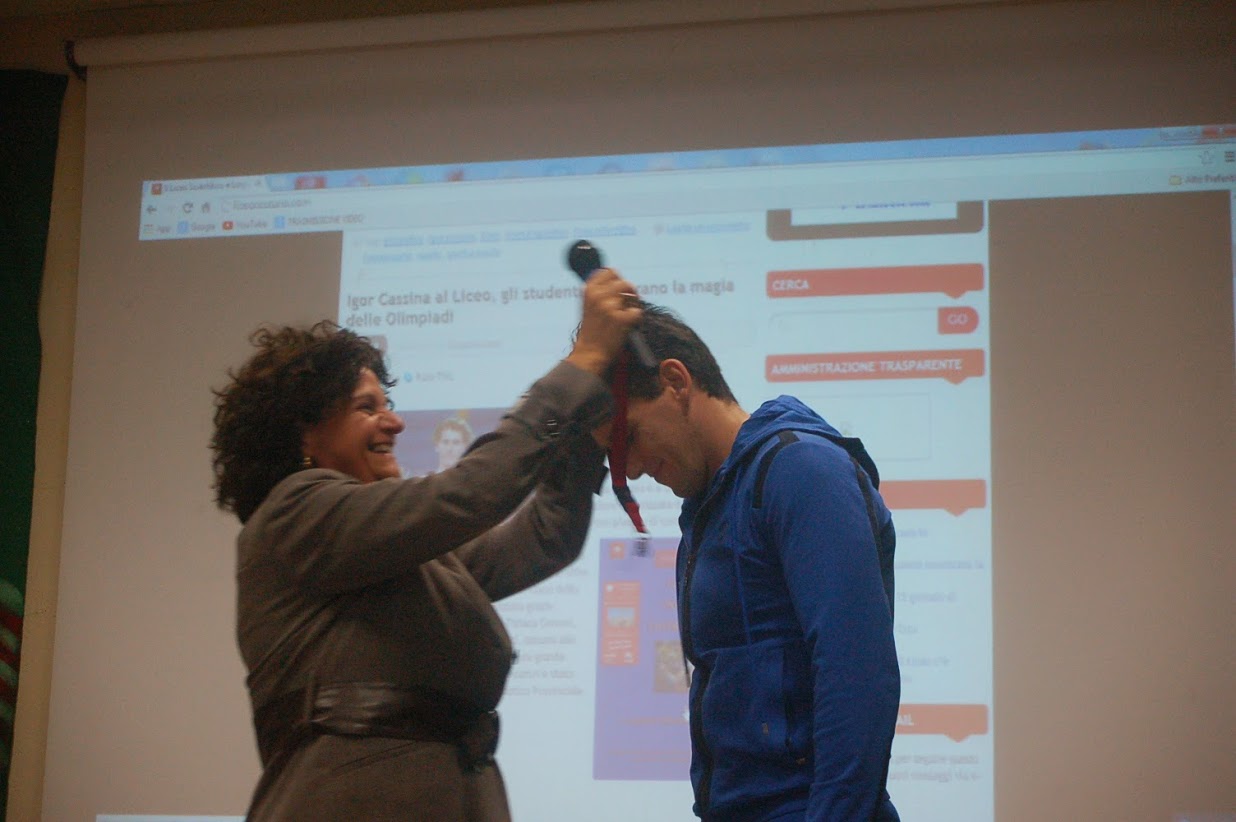 Sidney, che ha raccontato come da bambini considerasse Cassina come il suo idolo: è stata letta anche la lettera che Adtiana a 6 anni scrisse appunto ad Igor Cassina, esprimendogli la sua ammirazione e la sua voglia di emulazione. La preside, Concetta Senese, ha voluto “premiare” i due atleti con i rossi collarini del Liceo con l’aquila dei Conti di Ceccano