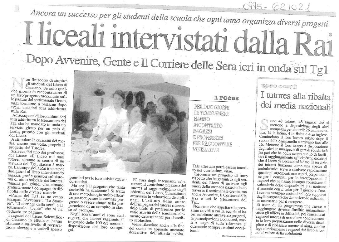 Continua l’interesse dei grandi mezzi di comunicazione per le iniziative del Liceo di Ceccano. Al centro dell’attenzione ancora i tutores, il gruppo di allievi che mettono a disposizione le proprie capacità e il proprio tempo per i compagni in difficoltà. Una troupe dei Tg1 della RAI è stata lunedì al Liceo e ritornerà mercoledì per ulteriori riprese e interviste. Prima del Tg1, se ne sono occupati l’Avvenire, la Stampa, Il Corriere della Sera, il settimanale Gente, nel numero in edicola in questa settimana.