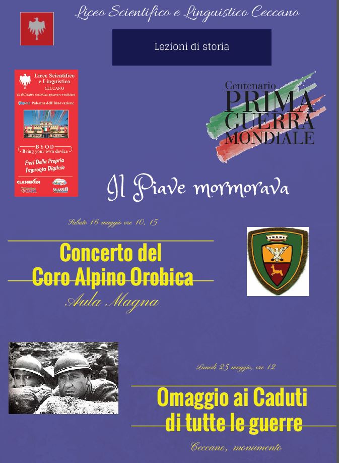 Cent’anni fa, in quello che sui giornali si chiamò il maggio radioso, migliaia di giovani venivano mobilitati e spediti a morire sul fronte orientale, sul Carso, nelle valli dell’Adigiano… . 4 lunghissimi e sanguinosissimi anni che hanno lasciato sul terreno milioni di persone, generando infine tanti conflitti latenti che provocheranno un’altra guerra mondiale. L’inutile strage, come la definì Benedetto XV, sarà ricordata dal Liceo con due momenti. Sabato 16 maggio, il Coro alpino Orobica, da Bergamo in viaggio verso L’Aquila per l’Adunata nazionale degli Alpini, terrà un concerto commemorativo nell’Aula Magna Francesco Alviti, con canti della tradizione ; lunedì 25 maggio ci sarà l’omaggio ai caduti di tutte le guerre con la visione del film La Grande Guerra di Mario Monicelli e una breve cerimonia con banda e bandiera al Monumento ai Caduti, per ricordare appunto i morti diogni conflitto
