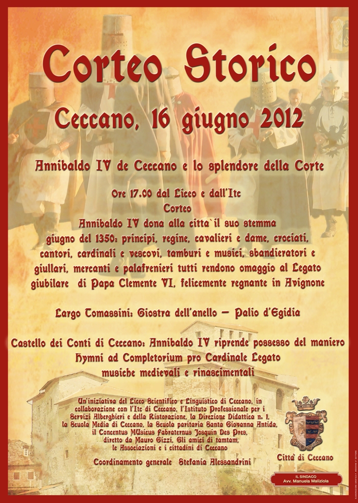 Ancora tre appuntamenti spiccano nel calendario: domenica 8 giugno il Liceo parteciperà al Corteo Storico, rappresentando la corte di Annibaldo IV da Ceccano e quella dei Conti della Città. Il corteo prenderà il via dal Liceo alle ore16,30.