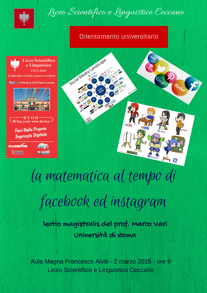 La matematica al tempo di Facebook ed Instagram, questo il tema della lectio magistralis che il prof. Marco Vari, dell’Università di Roma, terrà lunedì 2 marzo nell’aula magna Francesco Alviti, nell’ambito delle attività di orientamento universitario. L’inizio è previsto alle ore 9,15.