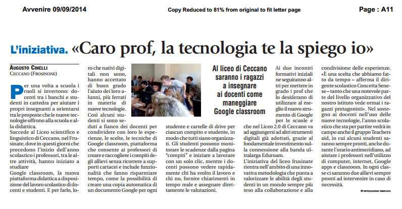 fare questo però il Liceo è stato affiancato da altri soggetti, senza la cui collaborazione nulla sarebbe stato possibile: innanzitutto i ragazzi ex allievi dell’Associazione Sirio che hanno affiancato docenti e ragazzi nell’uso delle Google apps for education, nello spiegare le possibilità di Drive, Calendar.. e poi il Consorzio GARR tramite la rete Unicasnet dell’Università di Cassino e del Lazio Meridionale, con la disponibilità del rettore, il prof. Ciro Attaianese, e dell’ing. Marco D’Ambrosio, del CASI, e poi quella di Stefano Cavese, di Aviproject, per la strutturazione degli impianti necessari all’infrastruttura di rete. Soltanto la sinergia di tutti questi soggetti ha potuto trasformare il Liceo in una scuola 2.0, a dimostrazione che le idee chiare contano di più dei finanziamenti.