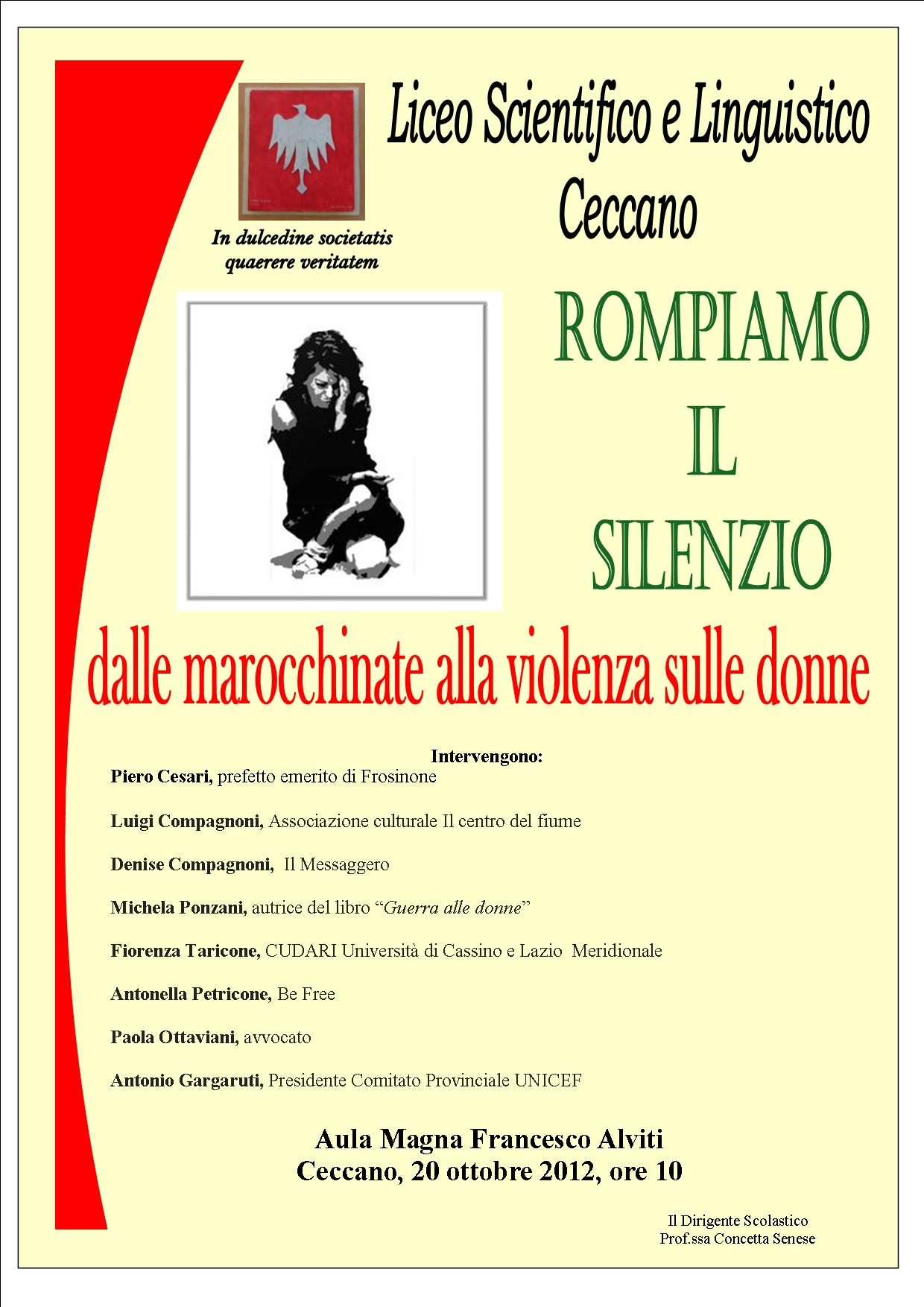 Se ne parlerà al Liceo di Ceccano, nell’Aula Magna Francesco Alviti sabato 20 ottobre, nel convegno Rompiamo il silenzio, cui interverranno il prefetto emerito di Frosinone, Piero Cesari, Luigi Compagnoni dell’Associazione culturale Il centro del fiume, che parlerà del ruolo dei Passionisti,ultimo baluardo contro le violenze marocchine, Denise Compagnoni de Il Messaggero intervisterà quindi Michela Ponzani, autrice del libro “Guerra alle donne”, Fiorenza Taricone, CUDARI Università di Cassino e Lazio Meridionale, Antonella Petricone, di Be Free, Paola Ottaviani, avvocato, e Antonio Gargaruti, Presidente Comitato Provinciale UNICEF.