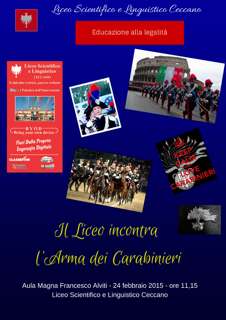 Il Liceo incontra i carabinieri, martedì 24 febbraio, nell’ambito delle iniziative di educazione alla legalità, un incontro importante per consentire ai ragazzi di confrontarsi direttamente con le problematiche del rispetto degli altri e delle leggi in vigore. L’incontro avrà luogo nell’Aula Magna Francesco Alviti, alle ore 11,15