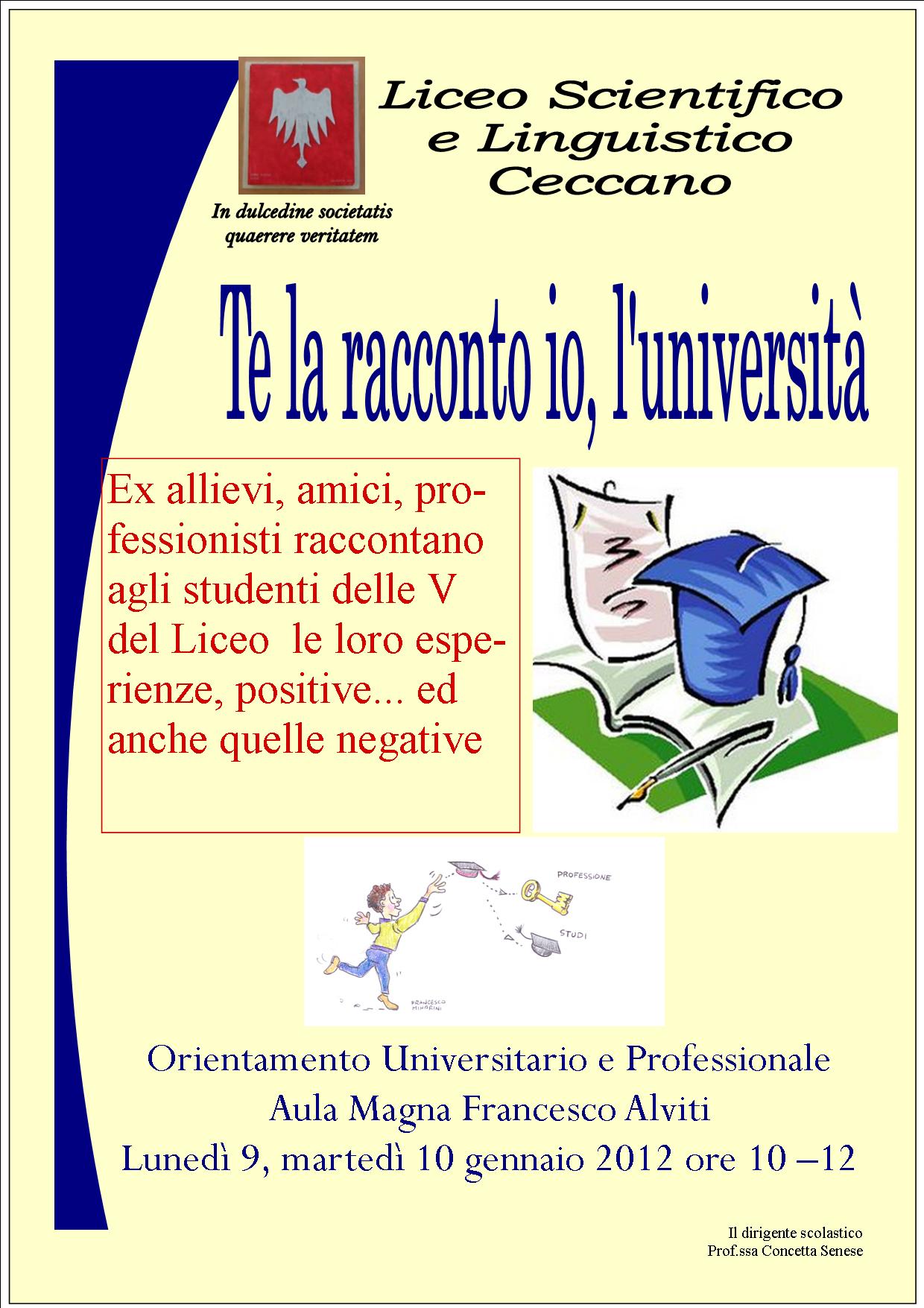 L’iniziativa è alla quarta edizione e negli scorsi anni ha suscitato notevole apprezzamento tra gli allievi che hanno potuto fare domande in maniera molto più semplice e diretta. Tutto è stato possibile grazie al gruppo del Liceo di Ceccano presente su Facebook che riunisce ad oggi oltre 1800 tra ex alunni, alunni e prof. Te la racconto io l’università è una delle tante iniziative che il Liceo mette in campo per aiutare gli allievi di V nella delicata fase della scelta del corso di Laurea. Da ottobre si sta svolgendo il corso di preparazione pomeridiano, oltre 100 ore, per affrontare le prove selettive di accesso; il Liceo è inserito nel programma Orientamento in rete, ci sarà quindi Una finestra sul lavoro, con l’incontro con esponenti delle diverse professioni. Responsabile dell’iniziativa è la prof.ssa Luisa Messina.