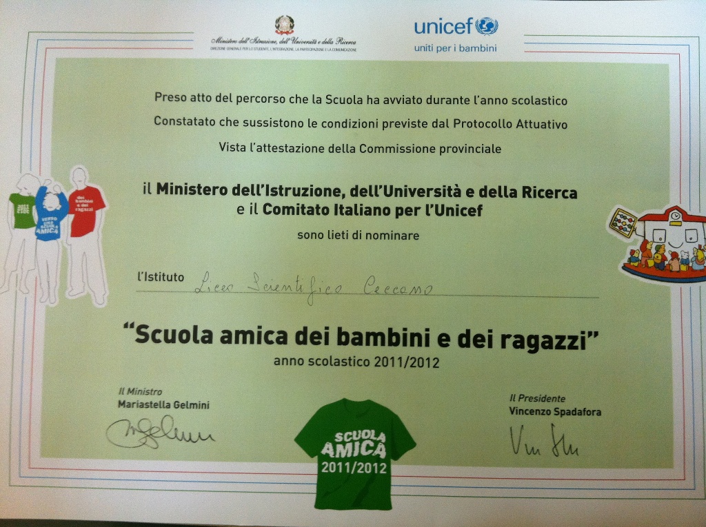 Il titolo di Scuola Amica è stato assegnato alle scuole che durante il passato anno scolastico sono riuscite a promuovere la partecipazione degli studenti alla vita della scuola. Il Progetto Pilota, che si inserisce nell’ambito del programma “VERSO UNA SCUOLA AMICA”, fortemente voluto dal MIUR e dall’UNICEF Italia per promuovere la piena conoscenza e la valorizzazione della convenzione sui diritti dell’infanzia e dell’adolescenza nel mondo della scuola è giunto al terzo anno di sperimentazione. Il progetto mira ad attivare