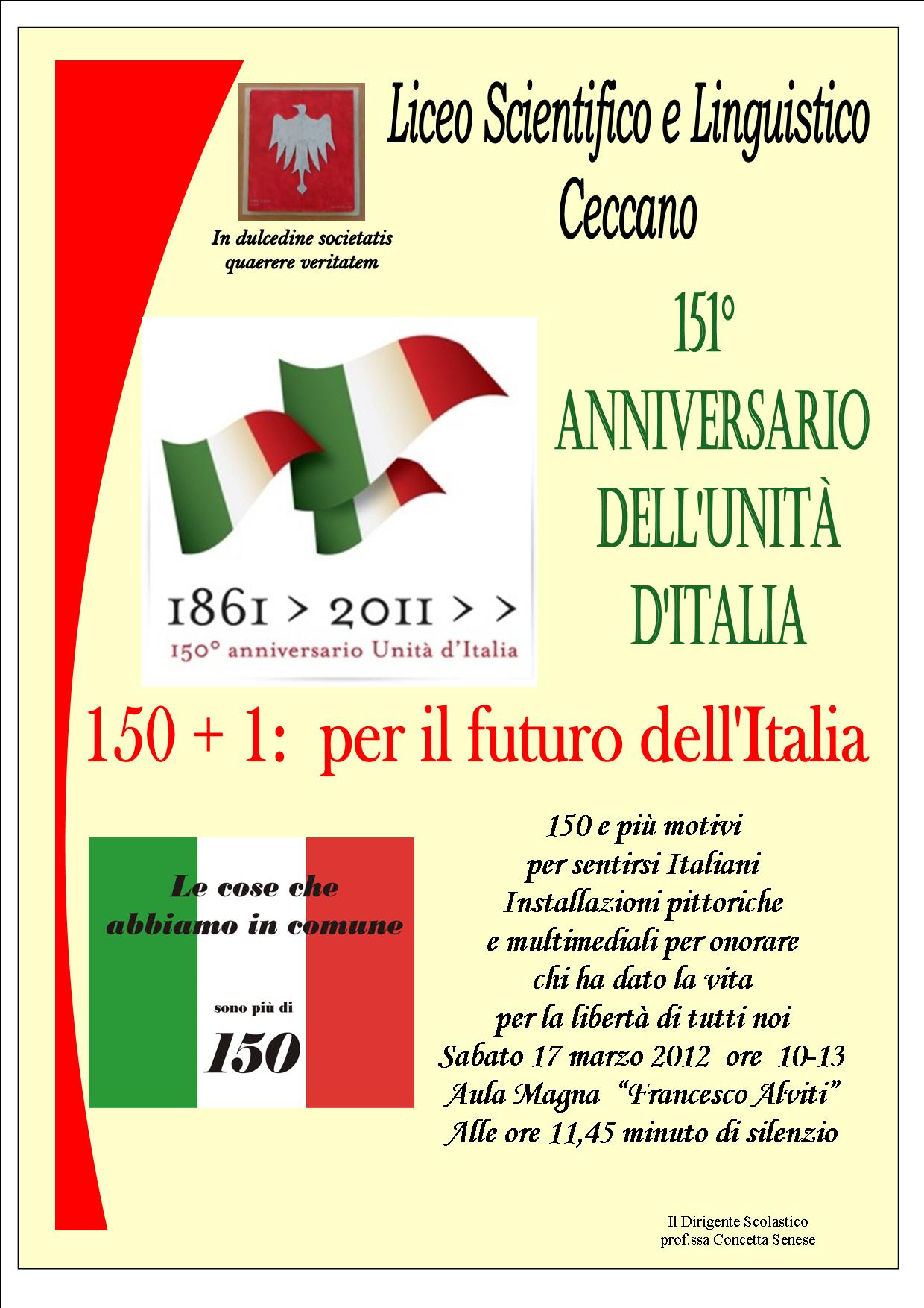 A conclusione dell’anno dedicato ai 150 anni dell’Unità d’Italia, il Liceo vuole dedicare la giornata del 17 marzo 2012, anniversario della proclamazione dell’Unità, al ricordo di tutti coloro che con la loro vita e con la loro dedizione hanno consentito all’Italia di essere una Nazione libera e moderna. Sarà anche l’occasione per rinnovare il personale impegno di cittadinanza attiva, secondo le indicazioni della Costituzione Repubblicana: